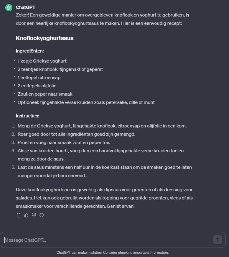 Voor de lol liet ik ChatGPT een recept voor mij fixen met als ingrediënten: overgebleven knoflook en een verloren bak yoghurt. Ik weet het, er zijn zat recepten, maar ik was op zoek naar een recept waarbij ik niet extra de kou in hoef voor ingrediënten die ik niet in huis heb. Plus mijn brein werkte niet mee. Dit was het resultaat: