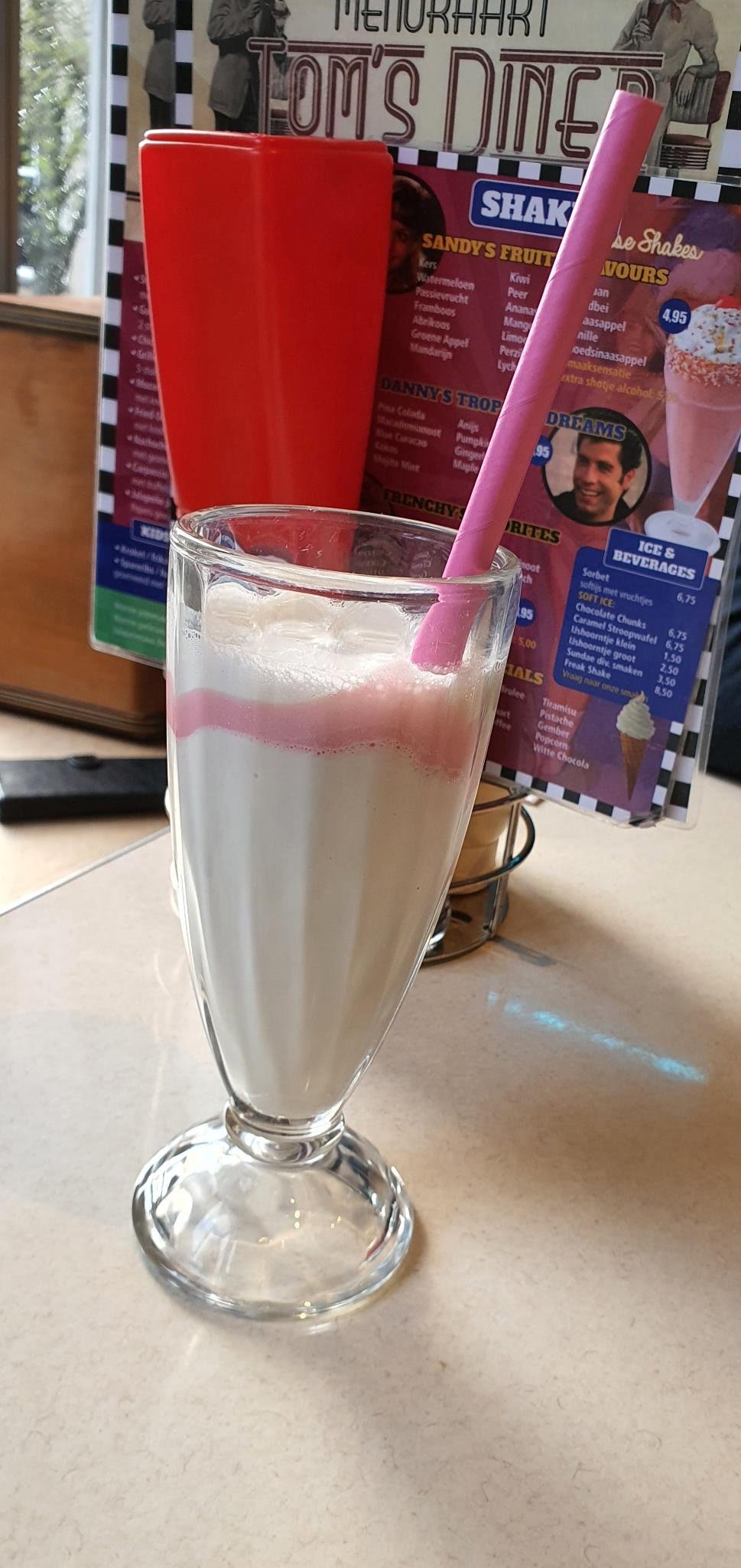 Wanneer je ook weg bent van de 50’s stijl zit je hier helemaal goed: de crew van Tom’s Diner is in deze stijl gekleed en zelfs het meubilair geeft je een “American diner vibe”! Je kunt zowel beneden als boven plaatsnemen, afhankelijk van hoe druk het is. Wat mij als eerste opviel: een milkshakekaart met wel meer dan 40 smaken waaruit je kan kiezen! Bubblegum, pepermunt, watermeloen, lemongrass… maar uiteraard ook gewone chocolade of vanillesmaak! Het is ook mogelijk om er een extra shotje alcohol bij te krijgen voor een meerprijs. Wil je je milkshake zonder slagroom hebben? Ook dat is geen issue voor Tom’s Diner!