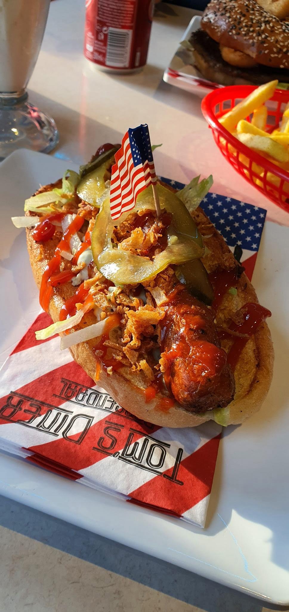 Als je nieuwsgierig bent naar wat je kan snacken bij Tom’s Diner, dan vind je hier de heerlijke menukaart. Ikzelf eet geen vlees en koos voor de Veggie hotdog. In principe zijn er wel acceptabele vega-opties als je niet verschrikkelijk kieskeurig bent. Omdat Tom’s Diner zoveel lekkers heeft, was één bezoek ook echt niet genoeg. Tot nu toe ben ik er drie keer geweest met mijn partner en elke keer kiezen we weer een ander gerecht en een andere smaak milkshake.